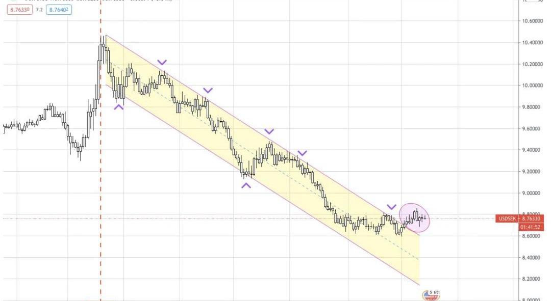 USD/SEKEUR/USD欧元也有类似的情况:又一次从下降的平行通道中正向突破,美元从通道之前的下行阻力线找到支撑。