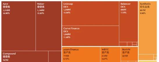 来源:DeFiPluse更细致地来看,笔者用如下树状图描绘了DeFi锁仓资金的分布,其中有两点发现值得指出:1.从平台类型的角度,资金锁仓规模从大到小依次是:借贷类>DEX>资产类>衍生品类>支付类。这说明借贷协议和交易平台在目前DeFi板块中处于领先地位,而去中心化支付方向尚未得到充分发展。2.从分布集中度的角度,较之以前,锁仓资金在各平台间的分布变化得更加分散,前五平台合计占比61%,而数月以前单排名第一的Maker便占比60%左右。