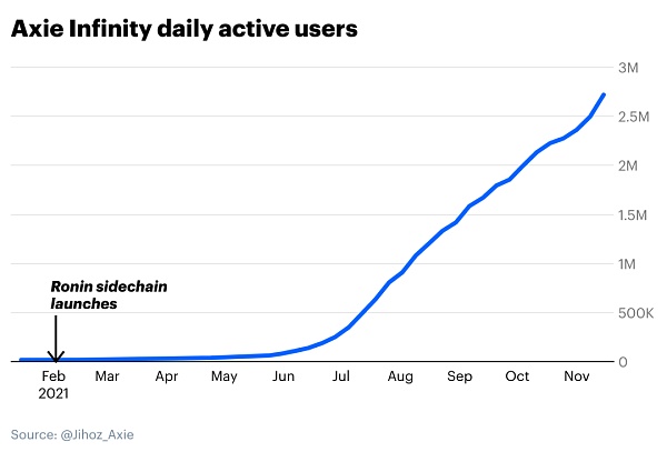 比如,当前热门的「边玩边赚」游戏 Axie Infinity 使用的侧链 Ronin 就是一个典型例子。Axie Infinity 是一款最初在以太坊上构建的 NFT 游戏,但由于以太坊的高费用使得玩这款游戏变得非常昂贵,因此该游戏背后的开发团队创建了以太坊侧链 Ronin,从而允许玩家将他们的 NFTs 和代币从以太坊转移至一个低费用的环境。这使得更多用户能够负担得起玩这款游戏,并推动了该游戏的大受欢迎。自 2021 年 2 月 Axie Infinity 迁移至 Ronin 侧链以来,该游戏的日活用户呈现快速增长,如下图所示: