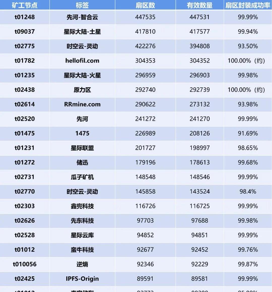 把一个空的硬盘分成一定量的区域,就叫做扇区,一个扇区大小为32GB。如果有扇区存满了数据,这个扇区将被密封。如果扇区丢失,会造成质押币的损失和有效算力的扣除。扇区封装成功率越高,被罚扣的质押币将会越少。有效算力排名前20位的矿工节点当中,有14个节点的扇区封装成功率超过99%,报错率降到非常低的水平,各大矿工在这个影响要素上都没有出现太大的问题。存储交易成功率和检索交易成功率