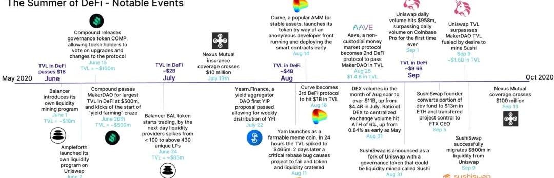 那么是DeFi领域是怎么一步步到达这一步的呢?让我们来看看这个夏天有关DeFi市场的事情。这篇文章有助于组织今年夏天DeFi中的一些关键的值得注意的事件,同时强调之前TheBlock研究工作在DeFi内不同协议的情况。关于协议的细节,重要的里程碑,以及TheBlock的额外研究,从时间线开始按时间顺序列出。