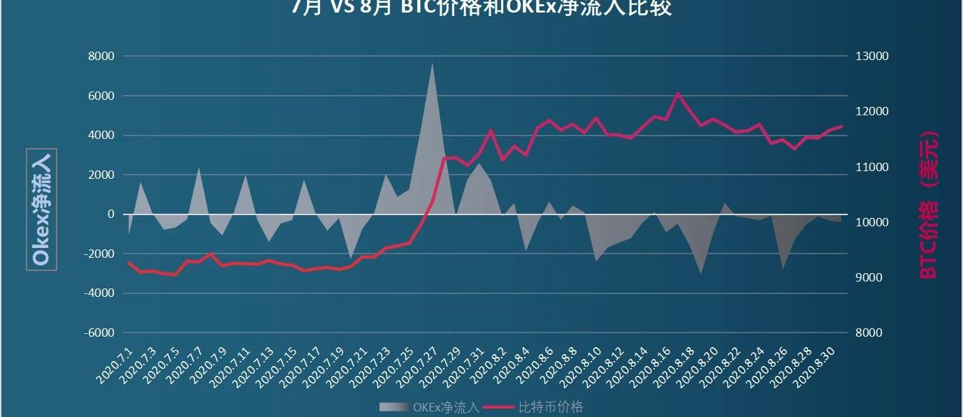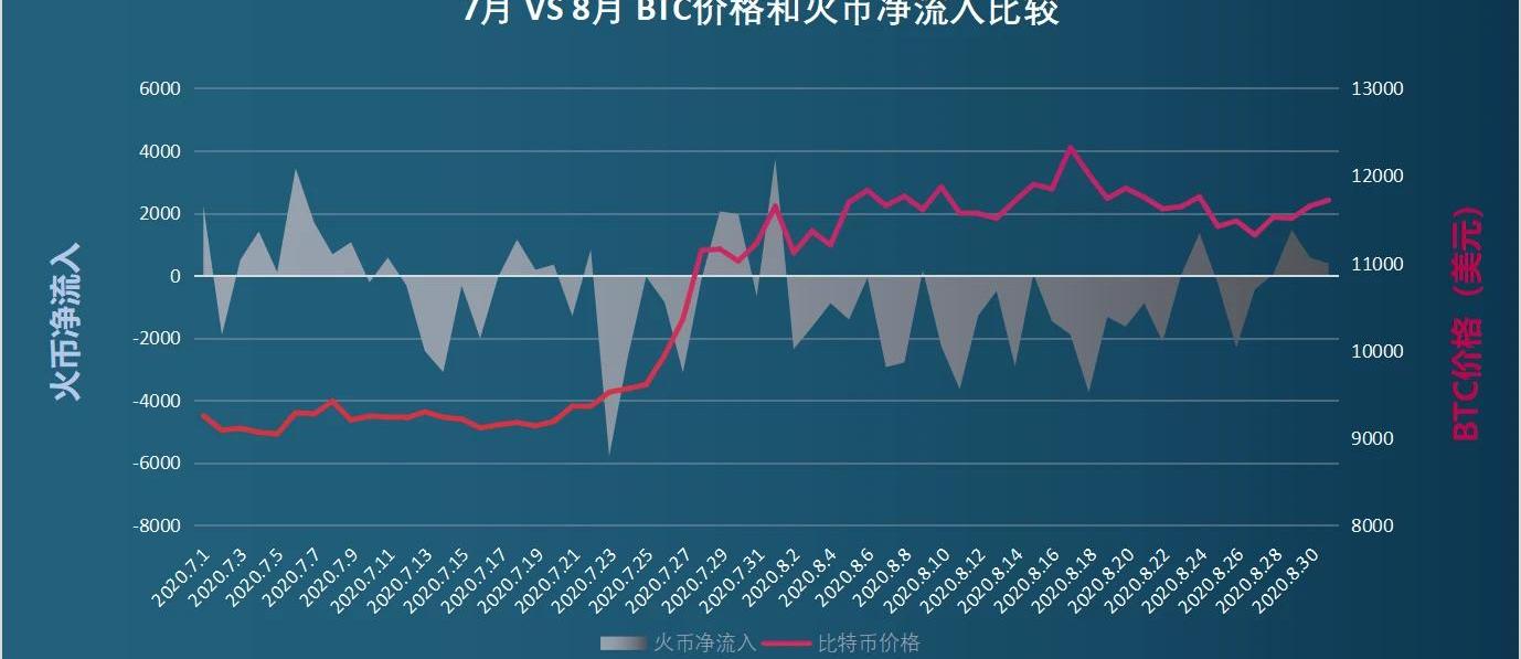 从2020年7月和8月两个月的币安净流入与价格比较来看,我们可以再次发现,在7月中这两个月的币安交易所都整体呈现出较为稳定的净流入状态,币价上涨净流入也随之上涨,为价格大涨后的市场做好了准备。