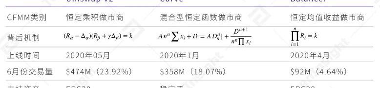 2018-2020年活跃用户数量图|TokenInsight上半年DEX各平台发展规模差异较大,Uniswap与Curve发展亮眼。Curve、UniswapV2与Balancer属于自动做市商,在6月份表现颇佳,占据了市场交易量的半壁江山。恒定函数做市商从其背后机制可分为四种:恒定乘积做市商、恒定总量做市商、恒定均值收益做市商与混合型恒定函数做市商。Curve、UniswapV2、Balancer作为恒定函数做市商的典型代表,其基本信息如下表所示。