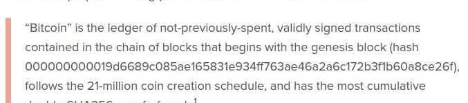 我想为比特币提出一个全面的技术上的定义:“比特币”是一个交易分类账,以区块链的形式记载带有合法签名、花费此前未花费资金的交易。这条链由创世块开始,其哈希为000000000019d6689c085ae165831e934ff763ae46a2a6c172b3f1b60a8ce26f,它按照预定的时间表、在积累了最多double-SHA256工作量证明的链上发行2100万枚比特币。来自Wasabi钱包的另一个定义,从解释全节点的价值来说,这个定义更直接了当: