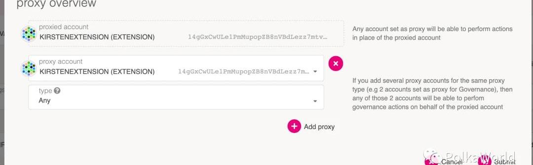 顾名思义,代理类型“Any”允许代理账户进行任何交易,包括余额转账。在大多数情况下,应该避免这一点,因为代理账户比cold账户使用频率更高,安全性也较低。非转账代理