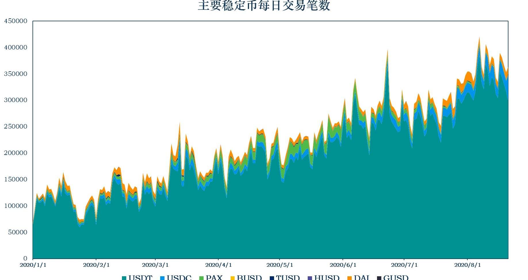 来源:MYKEY,CoinMetrics由于USDT迁移引发的链上转账金额较大,主要稳定币的平均每日交易额较前一周平均上升19.67%。二、稳定币的链上使用情况