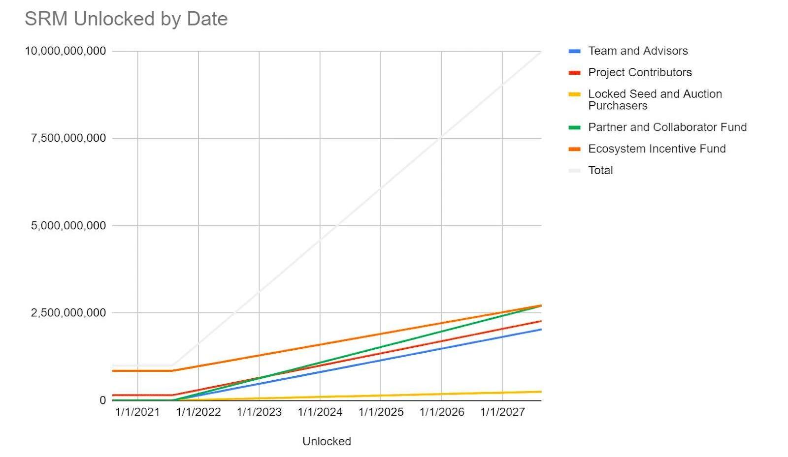SRM是去中心化交易所Serum的平台币。Serum基于高性能公链Solana搭建,有较强的兼容性,运行快速,支持跨链、稳定币、打包代币、订单簿以及期货交易。SRM作用是:交易费收入回购销毁;持有者可获得交易费折扣;可使用SRM支付交易费;节点质押SRM提供跨链服务并获得收入;另外还会包括一些治理功能,包括设置一些重要的参数。Serum也是加密货币交易所FTX在DeFi领域的一大布局。不过FTX方面也表示,为了创建真正完全去中心化的交易所,Serum将由独立基金会SerumFoundation独立运营。由于FTX的创始人青年才俊SamBankman-Fried的光环加持,Serum在推出之初就获得众多投资机构的青睐。然而,这些投资机构的热情很快就被浇了一盆冷水:投资锁仓期高达7年。根据《Serum白皮书》,SRM发行总量为100亿,其中90%锁仓,分7年线性解锁,并且上币的第一年不会有任何种子轮、私募轮的SRM解锁。如下所示: