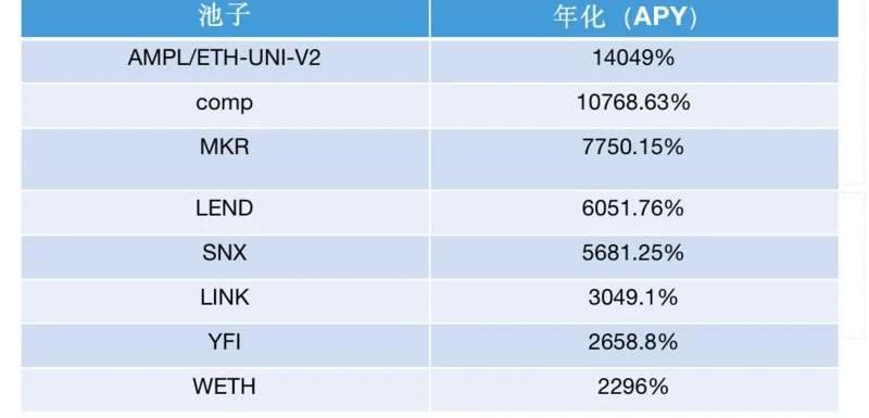 YamFinance是一个试验性协议,其定位偏向流动性挖矿聚合器。简单地说就是YFI+AMPL的模式,采用了YFI的挖矿产出方式,但支持几乎所有主流DeFitoken,YAM则是和AMPL一样的通胀通缩模型。YAM初始分配采用YFI模式,没有预挖,没有投资人份额。同时,YAM在算法稳定币Ampleforth的弹性供应模型的基础上增加了一个关键的补充机制,即每次供应扩展的部分都用于购买yCRV并将其添加到Yam储存库中,由Yam社区治理。YAM的最初总供应量为500万个。8月12日凌晨3点,DeFi项目YamFinance进行了首次代币分配,将其中的200万初始代币平均分配给8个质押池,每个质押池为25万枚,初始代币分配持续7天。8个池分别是COMP、LEND、LINK、MKR、SNX、WETH、YFI、ETH/AMPLUniswapv2LP。刚上线的YAM,就因为极高的挖矿收益获得关注,Gate以及Bibox等交易所也相继上线YAM交易。一天时间,YAM就吸引了超过8亿美元价值的8个DeFi代币质押挖矿,起量的速度和锁定资产量级刷新了DeFi项目的记录。根据Twitter大Vweeb的计算,最高的APML池每小时ROI可达1.6%,年收益高达14049%,表现最差的池子为WETH池子,每小时ROI为0.263%,年收益为2296%。