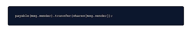 在(bool success,) = msg.sender.call{value: shares[msg.sender]}(""); 返回之前,被调用的外部合约可以被编码为再次调用withdraw(提款)函数。这将允许用户在状态更新前提取合约中的所有资金。