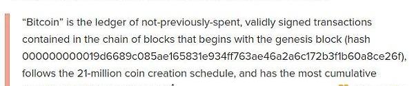 请注意,这种推理与我们经常听到的另一种推理方式截然不同:“根据定义”,更改规则的那条链在某种程度上其实并不是正确的链,无论有多少其他用户接受某些新规则,重要的是你依然可以留在自己喜欢的且遵循旧规则的那条链。下图是加文·安德森“按定义”观点的一个示例: