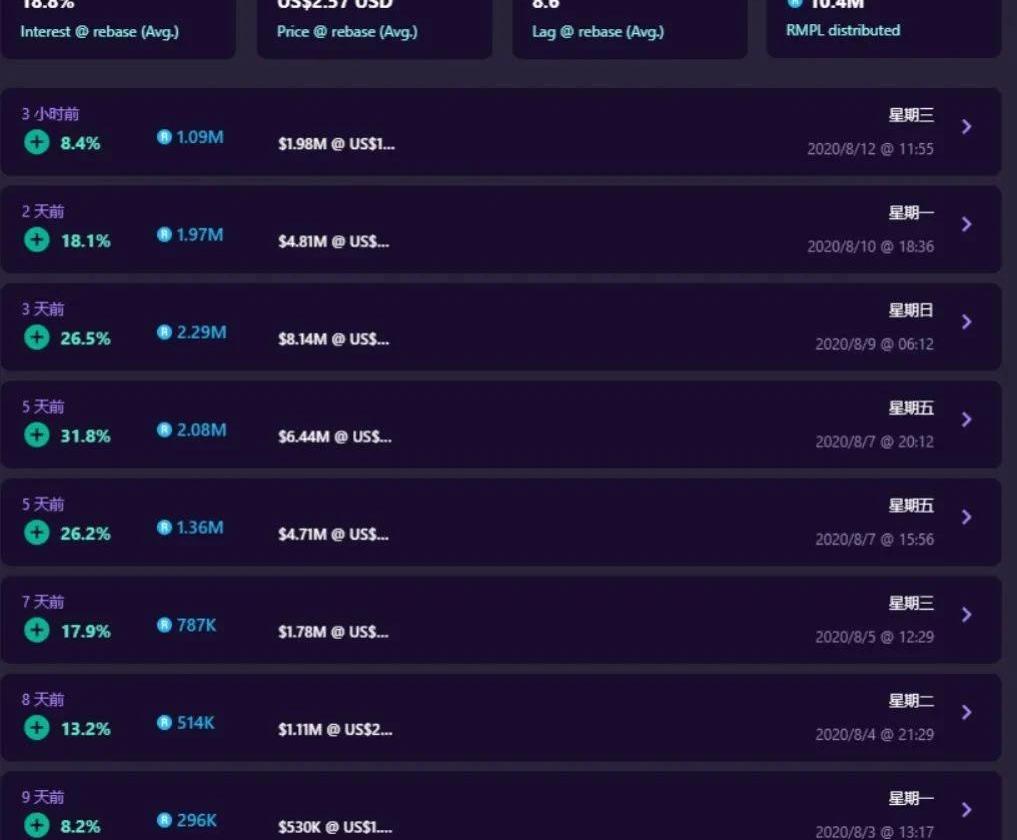 RMPL稳定的高比率增币对于AMPL系来说,其持续长时间稳定在10%-30%左右的分币,对用户来说是比较有吸引力的。大部分参与者会因为代币有上涨的预期和能够获得分币参与进来,所以长期稳定的高分币模式会促进项目良性的发展,并且让整个项目可持续下去。再利用稳定分币去各种社群宣传项目,很多投资者也会关注上这个项目并上车。仿盘多,雷区也不少