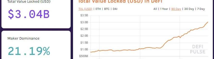 DeFi生态系统最新的30亿美元里程碑,是在TVL达到20亿美元之后的仅二十天便达到了。今年到目前为止,就锁定的加密货币作为抵押品而言,DeFi领域已取得了令人瞩目的350%的增长。自然地,如果以太坊价格上涨,TVL的数字就会继续增加。