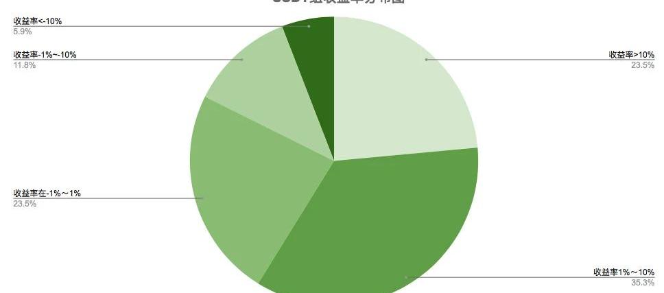 通过收益率分布图比较发现,BTC组收益两极化明显,各量化基金盈亏数量较为平均,激进型量化基金收益率表现情况一般,并承受更大风险。USDT组整体处于上涨状态,超80%以上的量化基金近7日收益率为正,并且超20%的量化基金产品收益率超10%。在数字货币市场开始整体转暖的情况下,风险偏好型投资者可选择BTC本位基金投资,在BTC上涨过程中收益叠加会获得更好的收益,但同时也面对着更高的风险。USDT组整体收益率情况稳定并且较为可观。