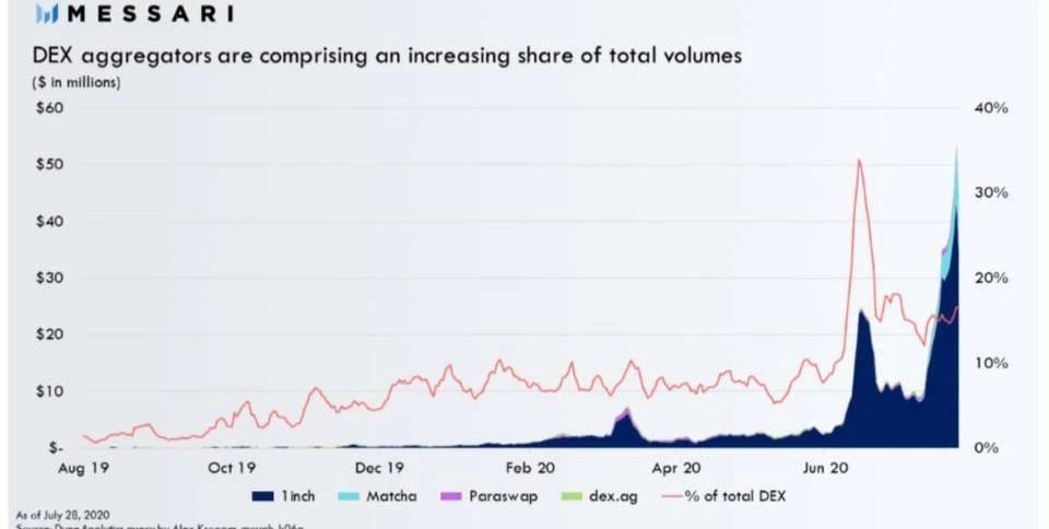 加密货币行业正在以极快的步伐发展,今天某个很火的主题可能跟下个火的主题没有任何关系,很少有DeFi项目能变成持续的行业主题。所有这些波动都会给市场基础设施带来戏剧性的影响,因此这会让DeFi基础设施发展难以追上市场发展,许多在DeFi基础设施领域全职工作的人同样意识到难度不小。对于那些在DeFi领域分配资金的人来说,基础设施问题同样非常重要,因为这会引发许多其他问题,比如:哪些借贷平台可以让你获得最高收益?哪个DEX可以提供最低滑点?哪些稳定币能够确保长期安全?不仅如此,这些变量正在持续改变,也让我们越来越难知道这些问题的正确答案。所以,DeFi聚合器在这个时候出现似乎时机刚好——用户不用烦心寻找究竟哪个DeFi平台最合适,哪个平台能够确保获得整个生态系统里最佳收益,他们无需一个个比照、挑选DeFi协议,聚合器可以自动找到最合适的投资标的。在DeFi领域里,我们已经开始看到部分产品已经有不错的市场/产品契合度了,这种说法其实并非空穴来风,因为目前以太坊上大约20%的DEX交易量都是通过DEX聚合器路由的,其中InstaDApp锁定了超过7%的DeFi总价值。