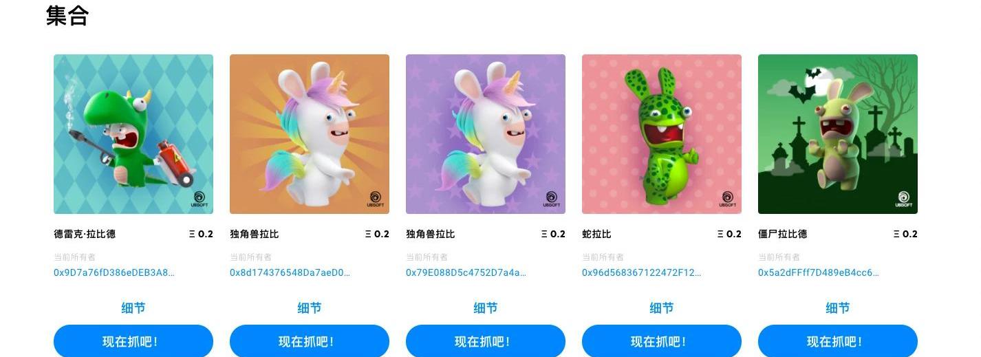 对于游戏爱好者来说,育碧这个名字并不陌生。作为法国最大的电子游戏开发商和发行商,育碧手上有着大量的AAA级游戏,包括《刺客信条》、《孤岛惊魂》和《看门狗》等等。在区块链领域,育碧也重点涉猎。此前,它曾通过「EntrepreneurLab」计划支持了8家区块链初创公司的发展,并与区块链游戏开发商Planetarium合作开发一款区块链游戏《九年纪事》。对区块链狂热的育碧,在以太坊开发也是题中应有之意,不足为奇。几个月前,育碧基于旗下广受欢迎的《疯狂兔子》系列,推出了「兔子代币」。该代币使用以太坊上ERC-721代币标准,每个非同质代币代表育碧游戏中的一只卡通兔子。代币只是游戏的一部分,具体工作原理如下:玩家将自己的以太坊钱包连接到游戏中,通过支付一定的ETH抓兔子;抓到后,用户钱包中就会出现一个NFT兔子代币,并在生成一个POPO证明;你所持有的NFT也可以被其他人抢走,但POPO证明永远存在——它可以证明你曾经持有某个兔子代币,也包含交易记录。玩家可以不断购买兔子代币,有一些可能是稀有的,直到凑够整个兔子图鉴,有点类似《加密猫》。但与后者不同的是,「兔子代币」是一个慈善项目,代币销售所得将直接捐给联合国儿童基金会。