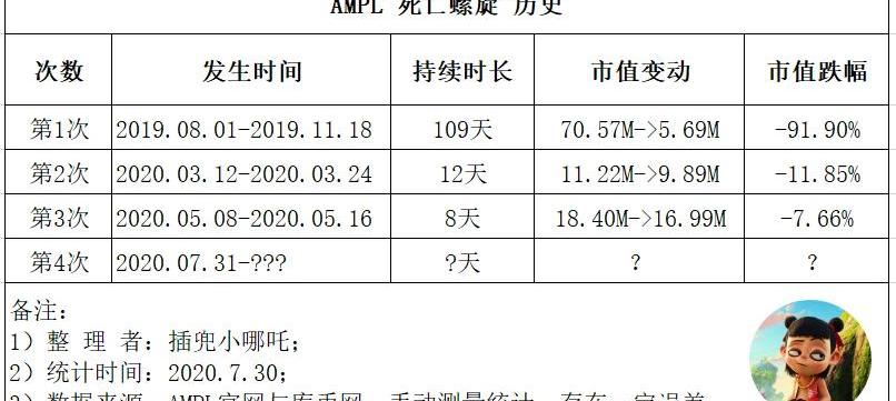 那么问题来了:第4次,死亡螺旋时间:2020.7.31~?,持续?天,市值又将下降多少呢?从前三次看,AMPL死亡螺旋持续的时间不断缩短,期间市值降低的比例也在变小。因此,如果延续这个规律,那么第4次死亡螺旋持续的时间不会太长,或许2~3天就能回到1美元上方,当然这一切都未可知,只是猜测。毕竟这次与前3次的死亡螺旋的差别很大,从参与的人数,市场的关注度,市值大小,都有了质的变化,毕竟在7月份之前,大部分人还不知道AMPL为何物,现在各DeFi群都在讨论AMPL了。如果AMPL走出这次死亡螺旋,那么将迎来一场更大规模的FOMO。