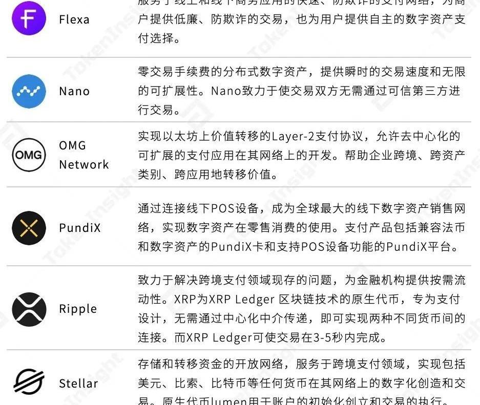 全球化进程规划,来源:AlchemyPay;TokenInsight总体而言,项目所提供的线上线下商家支付服务有较多的项目参与竞争,但AlchemyPay为首先提出法币和数字资产聚合概念的项目。AlchemyPay生态圈搭建良好,团队经验丰富,信息披露较为透明。项目目前发展相对处于早期,但团队背景不俗,后续市场推广值得期待。4.5综合对比根据对目前行业中具有代表性的项目的分析,Ripple和Stellar由于针对的行业痛点明确以及成立较早,是目前发展的最为成熟的项目,尤其是Ripple,其生态圈中不乏跨国银行和传统支付机构;而Stellar设有非盈利基金会,其通证分配透明化程度较好。实物卡发行也是项目关注的领域,需要项目具备较强的市场扩展和获取个人用户的能力,Crypto.com是该领域的代表项目,项目市场热度和全球影响力较好,但由于此类项目具备的资金托管机制,在资金安全性方面很容易被质疑。支付协议特指公链上的Lay-2扩展协议,代表项目有OMGNetwork,此类项目致力于实现数字资产的瞬时链上转移,帮助第三方的支付应用搭建。此类项目的重点在于技术可靠性和安全性。OMGNetwork技术原理清晰,但透明化程度偏低,团队信息缺乏详细披露。线上线下商户支付服务、企业支付解决方案提供等应用场景的支持是现在行业中许多项目竞争的领域。代表项目有AlchemyPay、PundiX、BitPay、Flexa、COTI等。其中AlchemyPay提出法币和数字资产聚合概念,搭建出较为完备的生态圈,项目发展虽相对处于早期,但后期发展值得期待。各项目多维度对比见下页: