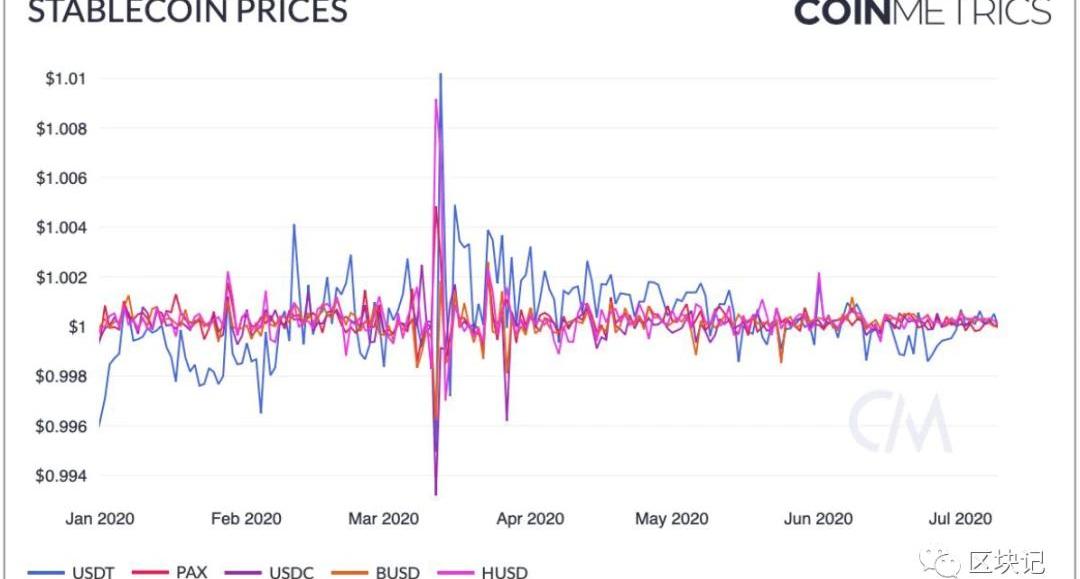 有两个稳定币的表现尤其比其他币差:GUSD和DAI。GUSD价格远远跌破其锚定价,最低跌至0.90美元。此外,它没有像其他稳定币那样恢复得那么好。这可能是由于GUSD的供应量相对较小,流动性较低。3月12日,GUSD的总供应量不到500万,而我们样本中的大多数其他稳定币的供应量都在1亿以上。DAI与锚定价的偏离与它作为MakerDAO生态系统中的去中心化稳定币的独特结构有关。3月12日ETH价格暴跌后,支持DAI的抵押债仓出现了一连串的清算。这导致了DAI在全系统范围内的极度短缺,引起价格飙升至其锚定价之上。USDT、USDC、PAX、BUSD和HUSD的恢复情况似乎要好得多,在暴跌后几天内就回到了接近1美元的价位。但如下图所示,USDT的价格仍然高于1美元。值得注意的是,USDT的价格在5月中旬之前一直明显高于USDC、PAX、BUSD和HUSD。