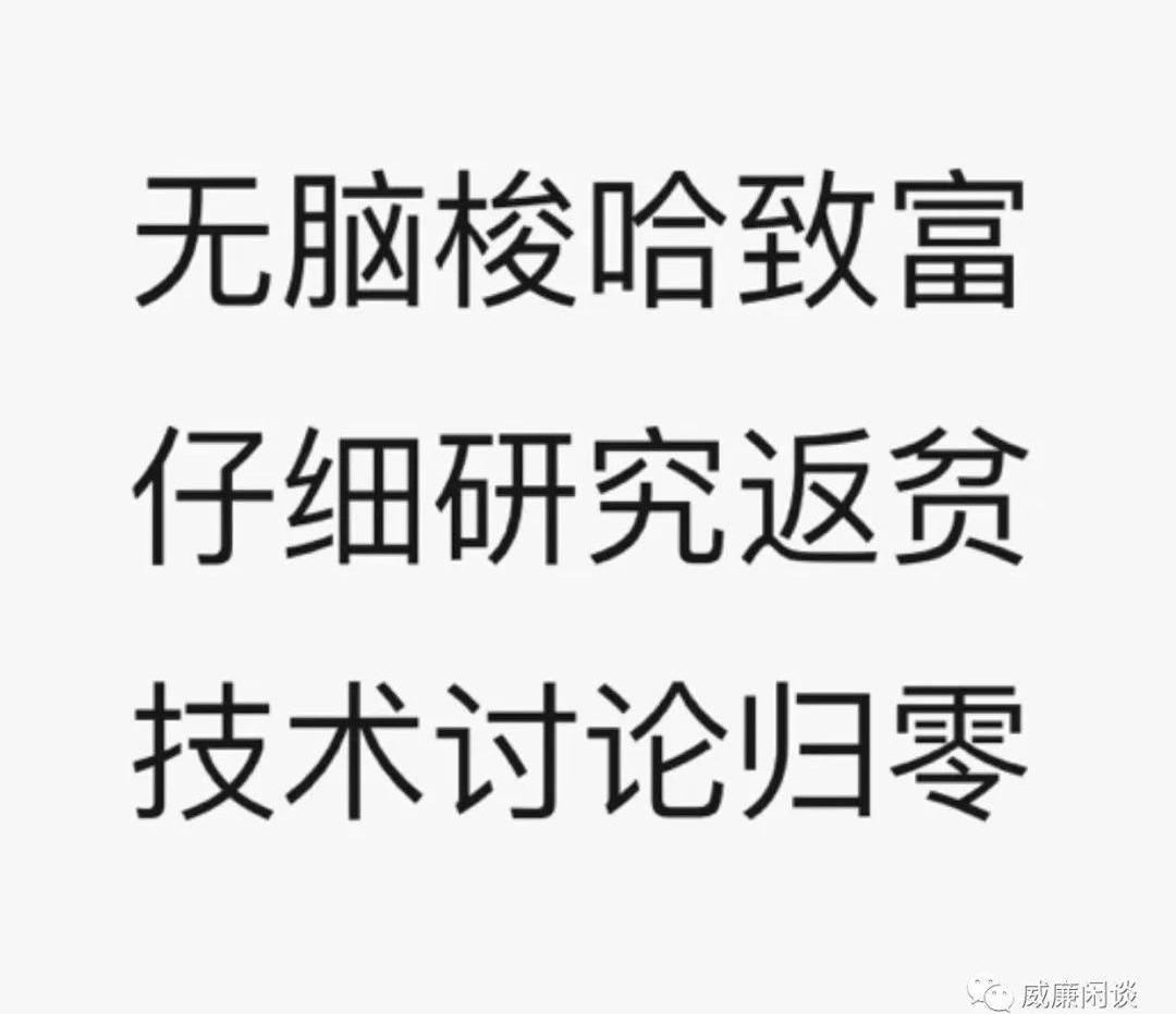 本来嘛,你的是下一秒涨跌,那么无脑冲其他散户的情绪和FOMO才是正确的操作。你研究基本面和讨论技术去下一秒涨跌,这不是扯淡嘛。所以很多人看不起别人在“冲冲冲”,完全就是在大小。其实错了,很多人在“冲冲冲”,只是在自己冲的比别人快而已。还研究呢,再研究都归零了。所以各位如果是纯投机的话,我建议不要研究了,冲吧。