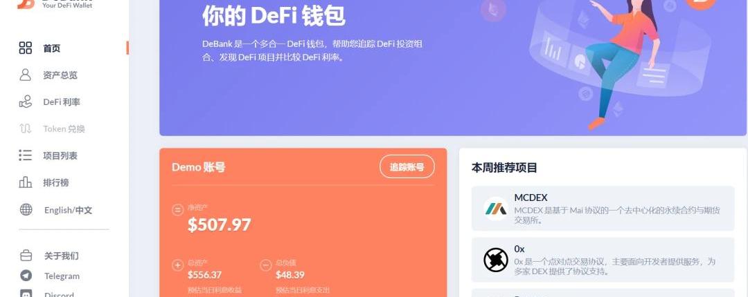 二、Debank(网站:https://debank.com)这是国内的一个专注于Defi的排名网站,内容团队精巧,之前和创始人汤洪波聊过,他表示现在Debank的数据都是分析合约的历史账本得出的,比较费时费力,目前只有精力做以太坊上的Defi项目的数据呈现。Defi数据站如果不严格掌控数据真实性,随便造假数据就能出来忽悠韭菜的话,很快可能又会走ICO老路子,在这里给Debank团队和汤洪波老师点个赞。可以看到现在国内一些Defi作者写文章援引Debank的数据也是越来越多了。打开首页首推的是钱包功能,可以绑定自己的地址或者ETH域名追踪资产情况,感觉还挺有意思的。