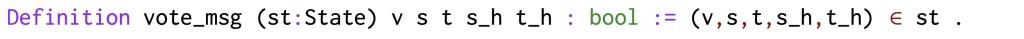 在某个区块处,如果活跃验证者集合的一个子集的权重超过整个集合权重的2/3,则该子集就是一个绝对多数集合。区块树。我们用区块哈希的有限型来模拟一个区块Hash:finType,另外,用genesis代表创世区块。我们使用符号h1<~h2这样的符号来表示区块父子关系,以此模拟检查点区块树。接下来我们使用h1<~*h2来定义祖先关系,h1就是h2的祖先,而h2就是h1的后代。至于祖先关系的属性,比如祖先的祖先也是祖先,与父子关系的属性类同。全局状态。状态可表示为由合理化投票组成的有限集合,投票的形式是(v,s,t,s_h,t_h),而v是发起投票的验证者,s和t是TA支持的来源区块和目标区块,而s_h和t_h是它们的见证高度。某一个投票是否有人发起过可通过一个布尔成员断言确定: