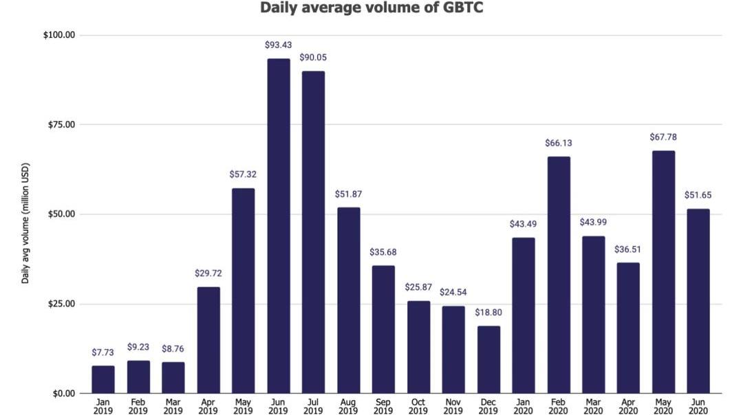 专门投资于比特币的封闭式基金GBTC在5月份达到10个月的高点后,在6月份的日均成交量下降了24%。
