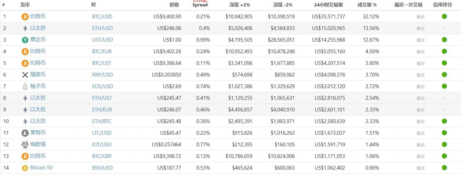 根据Bitfinex最近24小时成交量排名前15的交易对数据,我们可以看出,在Bitfinex的主流币交易对,点差范围在0.2%-0.5%附近,该深度对于资金巨大的用户来说会产生一些滑点,除了比特币、以太坊的交易对,其他币种流动性一般,交易分散性一般。二、成交量