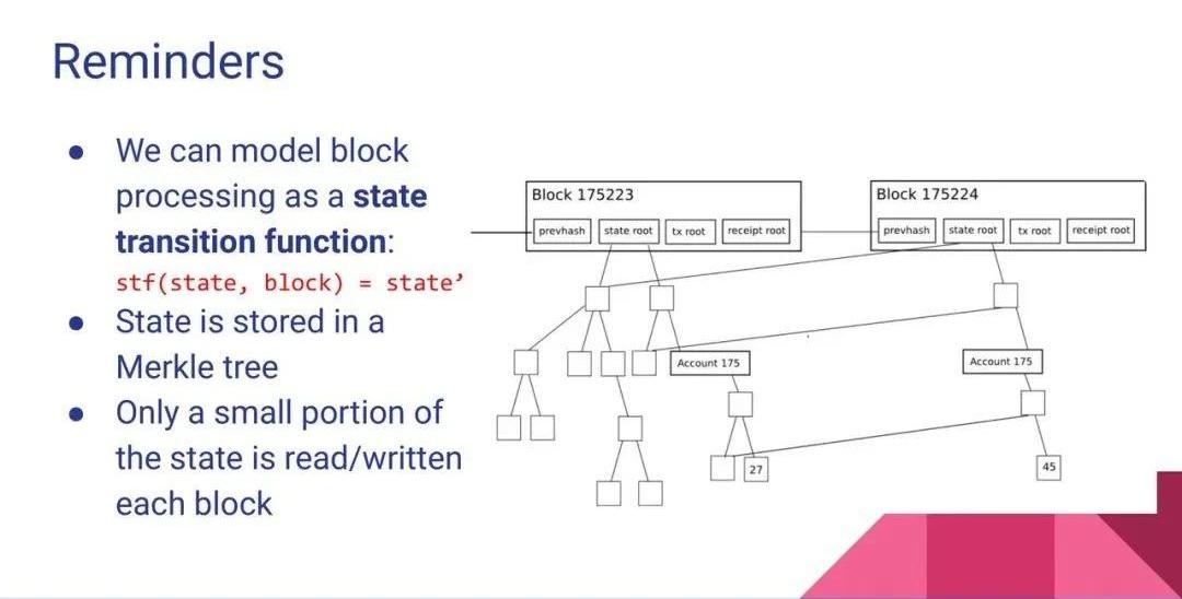 这一部分介绍了以太坊协议当前的范式和无状态范式,还介绍了无状态范式的好处。在当前的以太坊协议中,状态转变函数需要状态作为输入,但交易发送者并不提供这部分状态,而是默认接收并验证区块的人在本地维护了状态;因此,想要验证以太坊区块的节点就必须在本地保存全局状态的副本。而无状态范式改变了这一点,把“状态”输入替换成了“状态根+witness”,此处的witness,就是为了让区块验证者能够验证区块而附加的状态数据,有了这部分数据,验证的一方就不再需要在本地维护全局状态了。无状态范式能大幅提高节点同步区块链的时间并降低节点的运行负担。