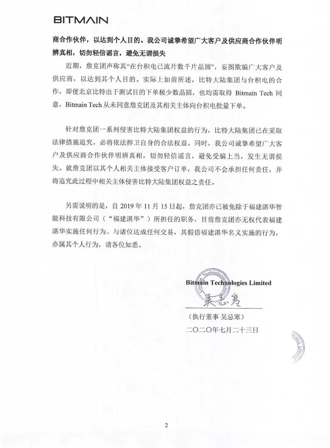比特大陆昨天发生了什么?针对“抢”矿机一事,詹克团方面发出了回复,称“抢”的矿机产权是北京比特的子公司福建湛华所有,而吴忌寒将产权转移给了新加坡比特的子公司重庆硅原所有,但这些公司都是开曼比特的子公司。所以一团乱账,各说各有理。吴忌寒方面发出的另一封信,信息量比较大,它提到了詹克团能否做出矿机的核心:台积电。这家万亿市值的巨兽,或将成为比特大陆内斗的关键因素。文章透露出几个重要信息:1:詹克团对客户说已经在“台积电流片数千片晶圆”。2:吴忌寒控制香港比特一直是比特大陆集团与台积电的签约主体。3:香港比特享有比特大陆集团所有在生产的BM芯片相关的全部知识产权。4:北京比特下单极少数测试晶圆,也要得到香港比特的同意。目前双方各不相让,在开曼漫长的官司结束之前,很有可能出现两个“比特大陆”和“蚂蚁矿机”。吴忌寒方面没有供应链,詹克团方面没有芯片,但都在补足这一环节,去造出能够赚钱的矿机。这封信透露出吴忌寒掌握的香港比特,是台积电的签约主体,因此吴忌寒方面有充足的芯片,由于矿机除了芯片以外都比较简单,重建供应链速度较快,据悉本月就可以发货。詹克团方面难题在于,虽然掌握深圳工厂,但也需要重新流片,时间很长。而台积电一定还需要支付预付款,需要庞大的资金。这也是詹克团最近不惜冒着违法风险“抢”矿机甩卖的原因。比特大陆的成功,至少有一半的功劳要归功于台积电。台积电的工艺比三星优秀,这也是比特大陆S19能相对于神马、嘉楠的三星8nm机器性能更好的核心原因。当然台积电也因为比特大陆赚取了大把钞票,曾经台积电大陆的女销售被称为“比特币女王”。至于双方和台积电的关系,据说最早是吴忌寒带队去和台积电谈判;但后续又是詹克团负责相关沟通,每几个月都亲自赴台打点。有可能双方都和台积电有比较密切的关系。而台积电方面,由于华为产能释放,目前产能相对比较充足。总之,台积电是绝对的强势方,它的目标只有一个,就是比特大陆更多出货,持续买它的芯片。目前台积电对此还没有回应,它会支持哪一方?会否给詹克团大量的芯片供应?目前尚不得而知,但将成为天平偏向哪一侧的决定因素,相信双方都在不遗余力地努力。詹克团方面回应: