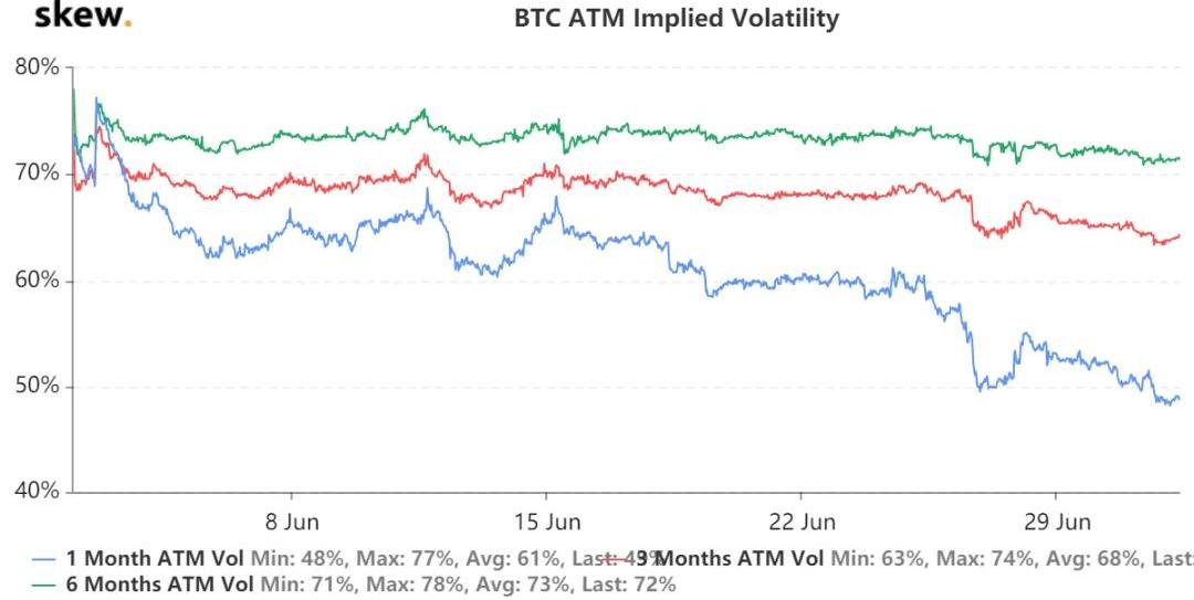 持仓量7.84亿美元,正在逐步增加。交易量平静,昨日deribit的期权交易量占到市场总交易量的93%。各标准化期限隐含波动率:今日:1m49%,3m64%,6m72%7/1:1m51%,3m65%,6m72%隐波平稳,中短期IV均已跌破今年低点。