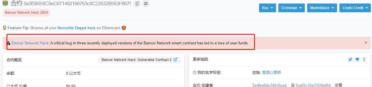 2020-06-18(文中所提及时间均为UTC时间),以太坊上的智能合约BancorNetwork被爆出存在严重漏洞。该漏洞由BancorNetwork团队和白帽最先发现,并第一时间对存在被盗风险的资金进行了转移,涉及资金50W余美元。此次事件中,存在漏洞的合约地址主要有如下三个:0x923cab01e6a4639664aa64b76396eec0ea7d3a5f0x8dfeb86c7c962577ded19ab2050ac78654fea9f70x5f58058c0ec971492166763c8c22632b583f667f2020-06-183:06:48,BancorNetwork团队利用此漏洞对存在被盗风险的用户资金进行转移,截至2020-06-186:56,BancorNetwork团队共计转移资金约合$409,656。另外两个公开邮箱信息的地址:0x052ede4c2a04670be329db369c4563283391a3ea0x1ad1099487b11879e6116ca1ceee486d1efa7b00也于同一时间利用此漏洞对用户资金进行转移,分别转出资金$131,889和$2346。到目前为止:EtherScan已经将存在此漏洞的合约进行标注,如下图所示
