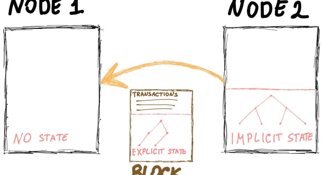 好了,现在我们都知道了,要将所有当前状态清零,只保留根哈希。数据量从40GB减少到32字节。太棒了,硬盘空间省下了,但是我该如何发送交易呢?这时,无状态以太坊就派上了用场。为了能够运行交易,你需要提供见证。见证包含所用账户、代码和合约存储内容,以及能够用来验证根哈希的默克尔证明。然而,ReGenesis和StatelessEthereum之间有一个区别。在解释这个区别之前,我想先介绍两个术语:显式状态和隐式状态。假设你在运行一个geth节点。无论你的对等节点何时向你发送了新的区块N,该节点都假定你已经拥有了验证该区块内所有交易所必需的状态数据,并且已经同步了区块N-1。
