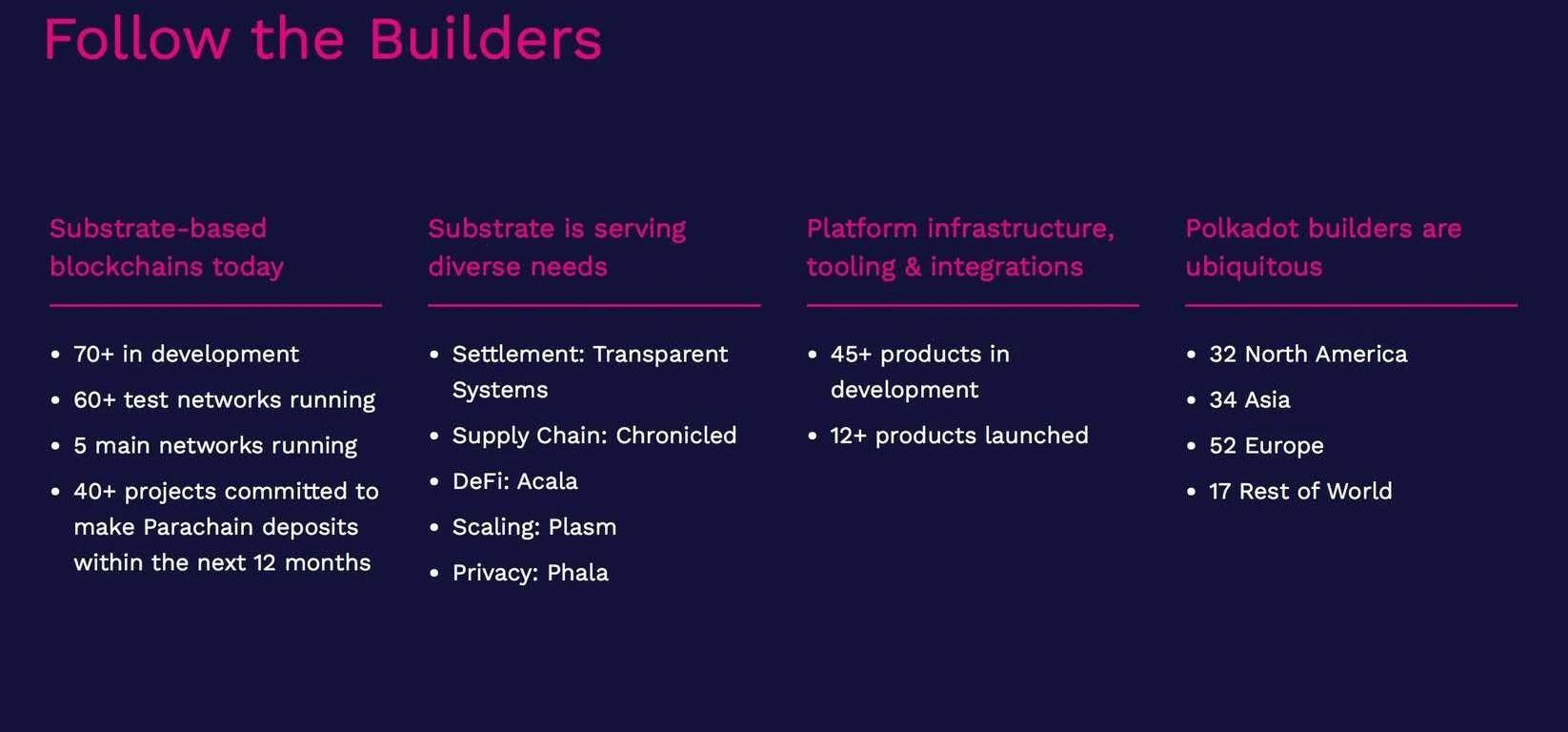 这张图显示的是波卡社区开发者的活跃程度。可以说波卡拥有区块链世界最活跃的开发者社区之一。开发进度非常快,有大量的团队加入。波卡以及它的金丝雀网络Kusama有一个非常强大的地方在于,社区决定协议的一切事务。比如最近有一个用户,打算将KSM(Kusama的代币)提币时,不小心输入了ETH地址,Kusama协议就决定将这个币退回给这个用户。一般而言,如果你输入了错误的钱包地址,那么你的币就永久性的丢失了。但是Kusama和波卡却可以决定将币归还给主人。可以说它们是第一个尊重产权的去中心化网络。