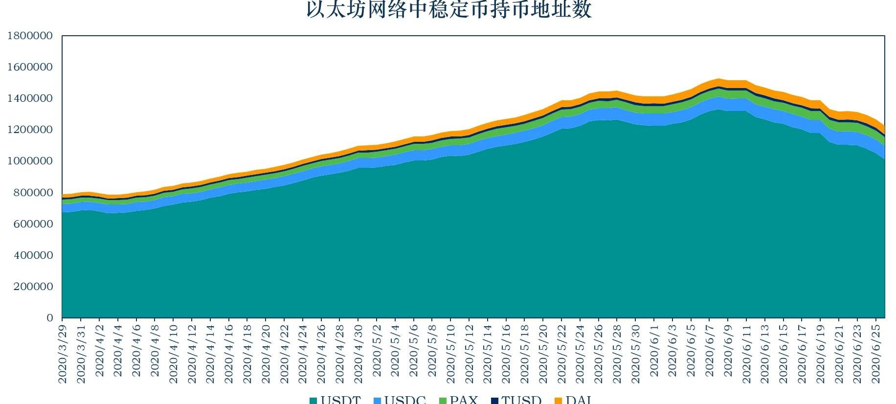 来源:MYKEY,Coinmetrics过去一周,稳定币市值增加了约1.45亿美元。其中,USDC的流通量增加1.24亿美元,达到9.53亿美元;BUSD、TUSD、DAI的流通量分别增加1737万、610万、774万美元;PAX、HUSD、GUSD的流通量分别减少514万、347万、124万美元。上周USDT暂停增发,流通量不变,USDC的流通量继续大幅增长。持币地址数