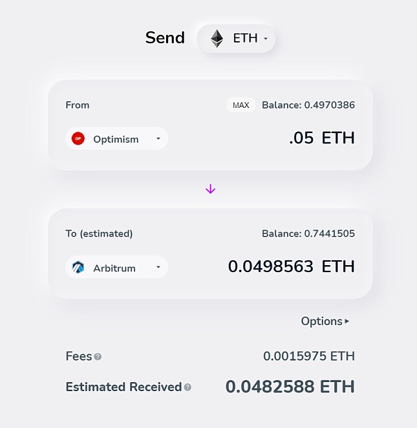 选择要发送的网络和要发送到的网络。目前支持 Ethereum、Arbitrum、Optimism、Polygon 和 xDai。