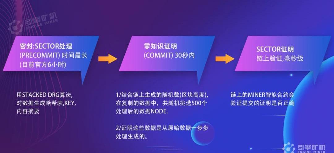 阶段一密封矿工会先获取存储订单,把数据切成256KB的小块,用特定算法(StackedDRG)进行密封生成副本。这个过程最耗时,数据越多,时间越长。初期,大家硬盘都是空的,就比谁存储速度更快,即"密封速度",这会涉及软件算法的优化、CPU、内存、以及硬盘的读写能力。这个过程会让硬盘几周内就被写满。阶段二复制证明接下来就是生成"复制证明zksnark"的过程,用特定算法对存储数据生成一个"零知识证明",以验证密封的数据来源于客户的源数据,需要在指定时间内(30秒)完成,并广播到全网,让别人确认该出块的有效,然后上链。这个过程要用到GPU加速,如果30秒内完不成,将得不到块奖励。阶段三Sector证明矿工会将客户提供的数据存放于网络中,这个区域称为扇区Sector。每个扇区会包含存储文件内容及承诺存储时长,确保客户在约定存储时长中,可以自由运用自身存储的数据。矿工添加一个扇区至\nFilecoin网络时,需要质押一笔锁定币。链上的miner智能合约会验证提交的证明是否正确,这可以达到毫秒级处理速度。