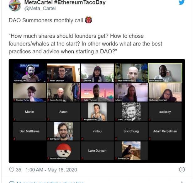 早在2019年初,尽管基础设施不断进步,dApp依然没有建立起来,也没有足够多的围绕不同可行案例展开的实验。我们决定将MetaCartel的重点转移到解决一个更广泛的更相关的问题之上构建dApps>基础设施随着五月初MetaCartelDAO真正开始形成,以太坊社区内部开始改变,发展。MetaCartel在多大程度上为社区带来了更多的产品关注,谁知道呢ーー但这在今天基本上不再是一个问题。TheNextFlippening:MoreDAOsthanTokens以太坊的今天现在我们已经看到DAO的产品在各种形式和大小的高级用户中取得了良好的效果,许多人正在通过管理协议的手段(Compound,Kyber,Aave等)或者草根群众集资的模式探索DAO。这些听起来都很棒,但是那些想要经营DAO的人可能很难理解如何才能变得高效。我们已经对如何建立一个社区以及如何在社会层面上对重要生态系统决策的去中心化有了一个非常坚实的想法。我们自然而然地越来越深入探索DAO。事后回顾,我们的选择是正确的,因为我们的文化更适合于以人为中心而非以技术为重点的项目。也许更重要的是,虽然我们许多DAO都有一些重复的共同点,但是几乎所有这些DAO都形成了自己独一无二的社区,其中许多在这些实验之前从来没有听说过MetaCartel或者DAO。那么,MetaCartel会变成什么样子呢?第三代:DAO的孵化