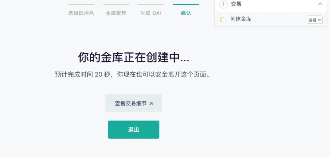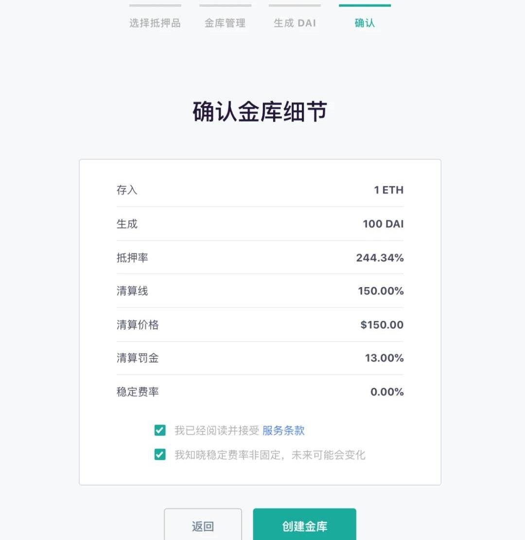 3.初次开启金库借Dai,需要进行授权。下一步填入抵押的ETH以及借Dai数量。确认金库细节后点击。