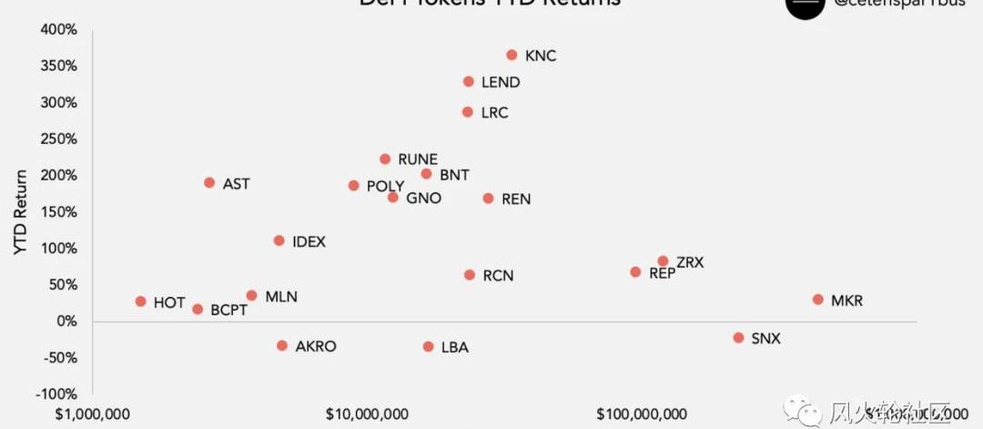 一位名为CeterisParibus的用户根据第三方网站总结了一份部分defi币种的今年表现情况,如下图:
