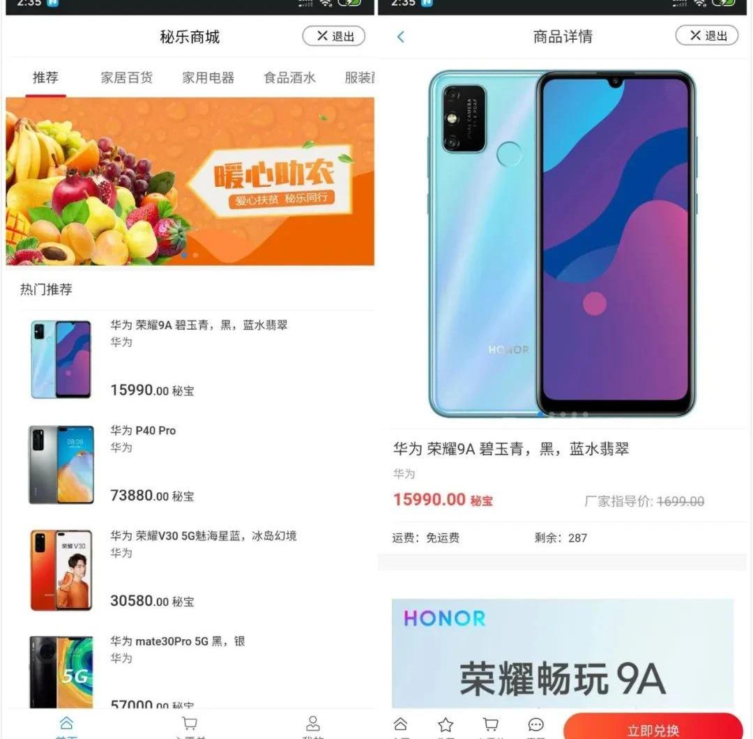 △秘豆/秘宝集市,玩家可以自行交易以秘乐商城为例,整体照抄淘宝。用户可以使用由秘豆兑换的秘宝在商城内购物,里面可以买到如家居百货、家用电器、食品水酒等。以华为荣耀9A为例,厂家指导价为1699元,但是如果用秘宝来购买则仅需要15990,即1599元,便宜100元。