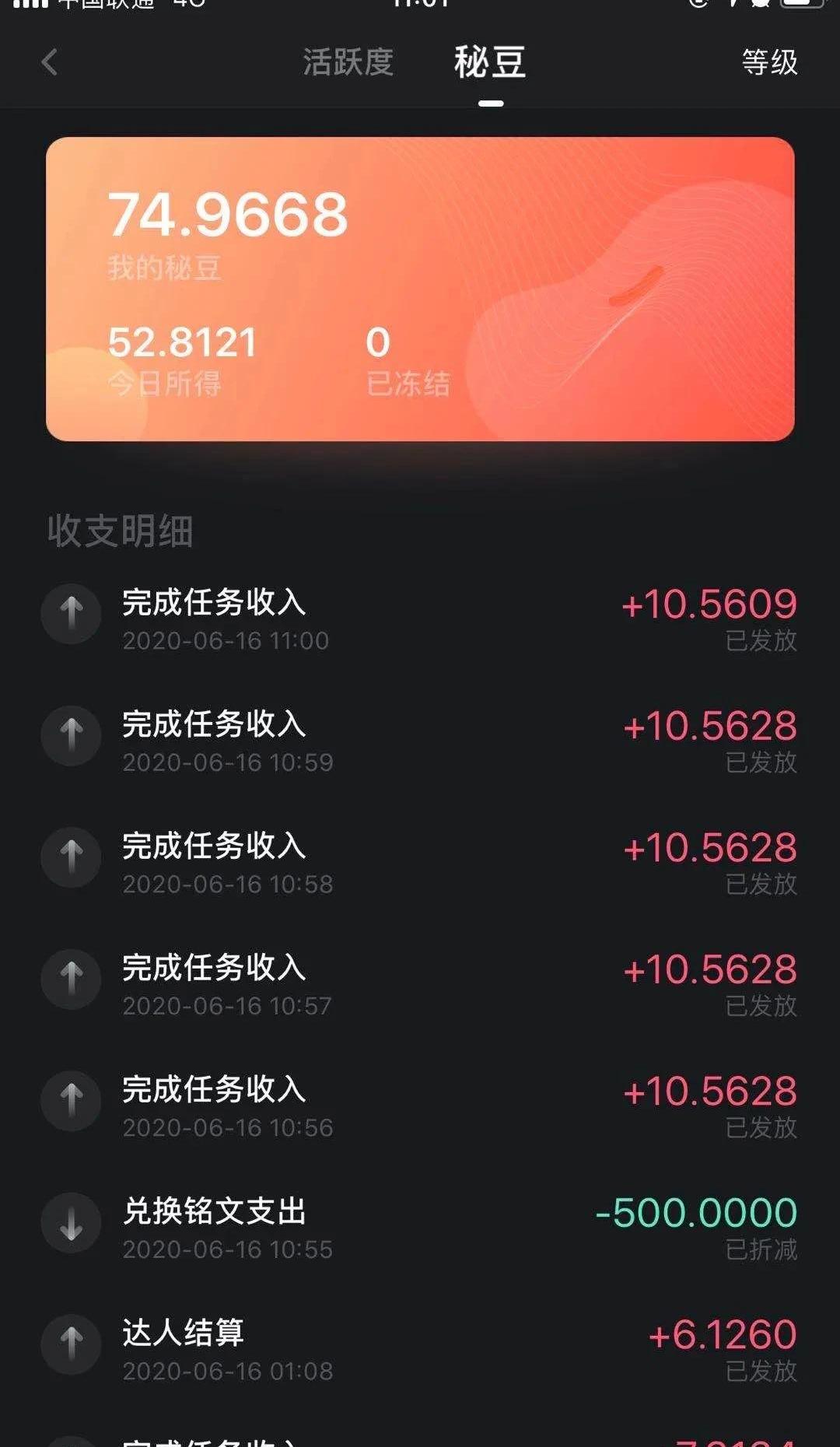 △秘乐达人制度及活跃度说明采访中,静姐手下的大二学生小邹表示,她做推广的一个多月来,就成为了小小主播,月收入已经有3000多元了,她还将妈妈也推成了主播,两人一起赚钱。而刚升级成璀璨钻石的静姐称,她现在每天仅仅是看视频就有50多颗秘豆,享受的手续费分红大约是6颗,按23元/颗计算,静姐的月收入确实在3-4万之间。据静姐介绍,她的上级已经做到了最强王者,一天的收益就在1万元以上,真正实现了“躺赚”。