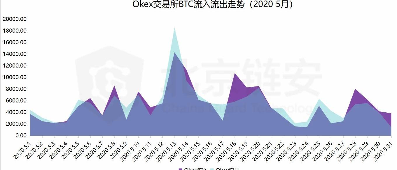 从2020年4月和5月两个月的火币比特币净流入与价格比较来看,同样也是在币价攀升波动期比特币的净流入波动较大,在币价处于10000美元波动期后,相对均衡,但是火币的净流入波动相对币安又更大一些。