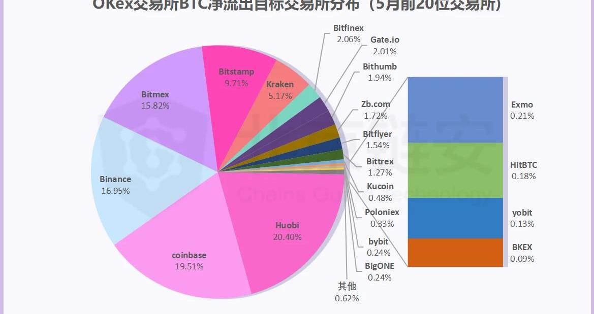 Okex流出的比特币主要去向中,Huobi、coinbase、Binance位居前三,三者差别也不大。综合来看,HBO三大所用户间的比特币往来较多,币安与国外交易所间关联度更高,而coinbase成为唯一一家与HBO三大所都有较大用户关联的国外大所。通过饼图,我们可以更直观的了解5月间,交易所流出比特币的主要去向。