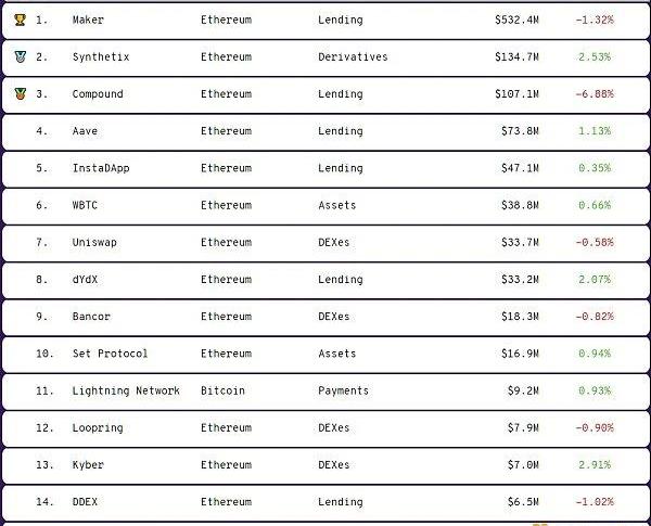 那这两者的数据是否有关联呢?从锁定值排名来看,Maker、Synthetix、Compound三者最高,超过了7亿美元,而这些锁定额度是包含了BTC、ETH、DAI等,并不包含其他代币。