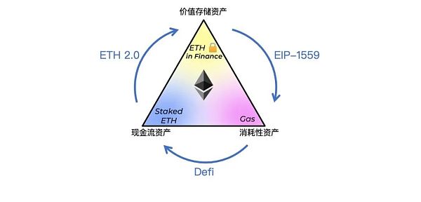 DeFi让ETH更具现金流属性 → ETH2.0让ETH更具价值存储特性 → EIP-1559让ETH更具消耗性 → DeFi让ETH更具现金流属性