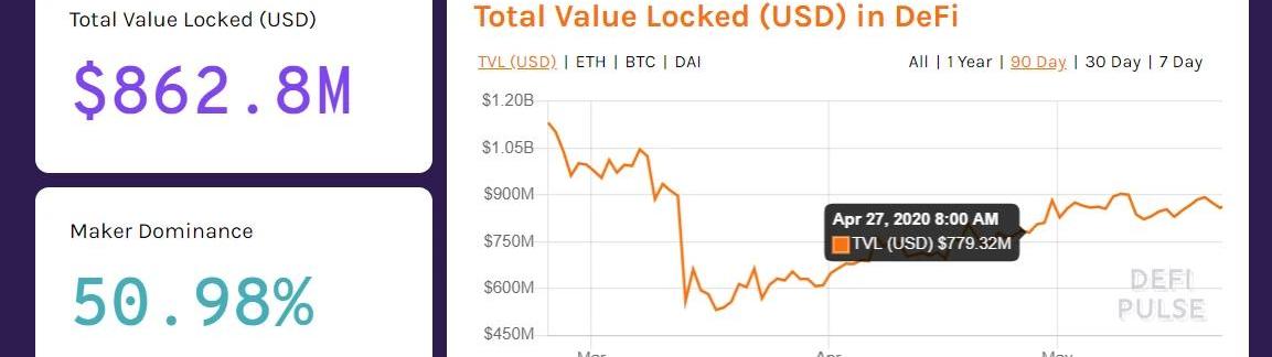MakerDao自上线以来,其稳定币DAI始终保持相对美元的稳定状态,成功满足了货币交易媒介、储藏价值、计价单位的职能。当然其也是一个成功的资产抵押借贷平台,为杠杆融资提供可能。而对于USDT这种中心化发行的稳定币的不信任,恰恰是促进DAI这种去中心化稳定币得到广泛接受的原因之一。在DefiPulse中,我们可以看到图2所示。Maker占DeFi世界所有代币锁仓价值的50%。