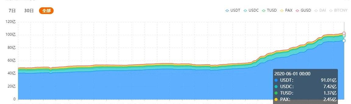 来源:QKL123截至2020年6月1日,稳定币的总市值约为724亿元,过去七天的日均成交额约在1200亿元左右。据不完全统计,法币抵押型稳定币的市值远远高于加密资产抵押型稳定币。在法币抵押型稳定币中,USDT的市值占比高达88.91%,USDC的市值占比为7.26%。在加密资产抵押型稳定币中,SAI的市值占比为62.28%,BitCNY的市值占比为37.72%。近几年来,虽然有越来越多稳定币的出现,但依然没有撼动USDT的市场地位。一方面是USDT的大而不倒,特别是在各大交易平台的加持下,一直游走在监管之外。即使被曝储备不足等,挤兑风险依然较小,目前出现崩盘的可能性很小。另一方面是USDT的需求在不断增加,即使一直在不断增发,先发的网络优势和便利性,使得市场交易需求也出现明显增加。为什么SAI却快速下降?