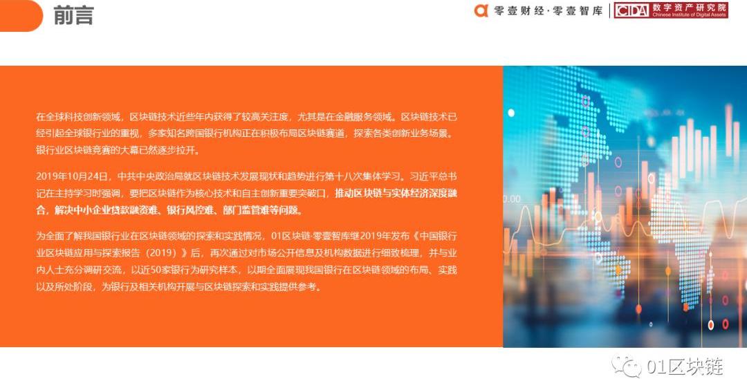 编者按:本文来自01区块链,作者:照生、雨林、赵越、王梦婷,Odaily星球日报经授权转载。提高效率与降低成本是各行各业在市场竞争中不变的两大追求。然而在信息差客观存在以及市场主体地位不同的背景下所进行的市场博弈,往往会令成本居高不下且严重降低协作效率。在全球科技创新日新月异的背景下,应用新技术实现降本增效成为众多行业不约而同的选择。而在众多新技术中,区块链以共识算法建立信任并保证链上信息难以被篡改且可追溯的特性,为市场协作提供了良好的保障。尽管区块链最初专为比特币而创建,但今天区块链技术的应用潜力远远超出了加密货币的范畴。尤其是在金融服务领域,区块链技术已经引起全球银行业的重视,知名的跨国银行机构正积极布局区块链赛道,探索各类创新业务场景。银行业区块链竞赛的大幕正逐步拉开!中国银行业在区块链领域活跃而丰富的探索与实践已经成为世界银行业改革的一个缩影。为更直观呈现中国银行业在区块链领域的应用实践历程和所处阶段,01区块链通过对市场公开信息及机构数据进行细致梳理,并与业内人士充分调研交流,以近50家银行、数百条银行区块链实践数据为样本,编写了国内首份系统性银行区块链应用报告——《中国银行业区块链应用与探索报告》,以期全面展现我国银行在区块链领域的布局、实践以及所处阶段,为银行及相关机构开展与区块链探索和实践提供参考。5月20日,零壹财经·零壹智库联合数字资产研究院举办报告线上发布会,区块链分析师蒋照生和林泽玲在会上发布了报告,同时邀请了趣链科技北京分公司副总经理张贝龙,对趣链科技服务银行业的实践经验与案例进行了在线分享。以下为报告全文: