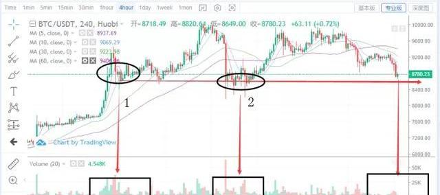 前几篇的文章分析中,我们的分析是9300弱势整理,8600再等待进场。我看到群里有人在9500开空,开了50倍,9400平。我们无法去评价这个操作,因为每个人有自己的风格,仓位也好,资金也好,都有自己的想法。但这种操作对于希望建立长期稳定盈利的投资者来讲,显然不是一个明智的选择。这是聊行情分析之前的题外话,但却是交易中最重要的环节,放弃侥幸!行情的逻辑,如上图所示,8500-8650的区间即1/2黑色圆圈中的区域是K线重叠和成交量最密集的区域,之前我们有讲过成交量代表市场的资金的情绪,在一段行情的走势尾部,一旦出现成交量的放量且价格震荡来回震荡很大,但是价格却没有怎么增加或者下降,便是市场分歧出现最大的时候,往往这时候在酝酿着一场新的阴谋。黑色圆圈1/2正好符合这个条件,而K线的密集区就会在投资者心中留下一个锚定效应,认为每次到这里应该都会有相同的情况产生。所以,在锚定区进行交易的时候,量能的变化逻辑把握就决定着你是否跟牌或者加注。策略上面我们维持之前的策略,当放量下破8600并快速回抽的时候进场3成仓,快速下破8488止损,上升站稳8900加仓2成。ETH行情分析