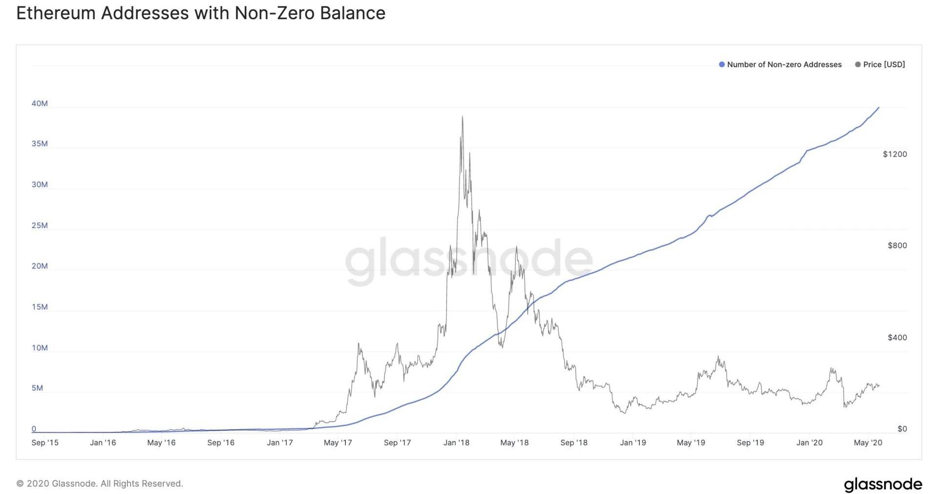 而促成交易量不断上涨的推手,则来自四个方面。1.看涨买币,交易活跃今年对以太坊而言,有一个重大的利好:Eth2.0阶段零信标链即将正式上线。按照开发团队年初的预期,今年第二季度有望问世。虽然按照以太坊一贯的调性,能否如期上线仍是一个未知数,但这并不妨碍投资者对以太坊的看好情绪。特别是随着Eth2.0多客户端测试网「Witti」成功上线以及阶段1等工作取得进展,这种看涨情绪更是被转化成实实在在的购买力。今年以来,ETH/USDT累计上涨接近90%,ETH/BTC累计上涨接近40%。Glassnode的链上数据显示,目前有4000万个地址拥有ETH,而今年初只有只有不到3000万个,涨幅超过30%;过去两年,ETH非零地址数量更是以近乎直线的趋势上涨。